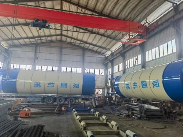 開原雙圓機械廠車間內(nèi) ,焊接完成的攪拌站各組成部分,已經(jīng)在起吊,準備裝車運往客戶安裝現(xiàn)場。